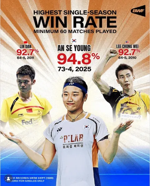 据世界羽联官方统计,安洗莹2025赛季稳居女单世界第一,全年12次闯入决赛拿下11冠,交出73 胜4负、胜率高达94.8%的恐怖成绩单。这一数据打破了1989年有完整数据记录以来、单赛季出战不少于60场的单打选手胜率纪录,此前该纪录由林丹(2011赛季,92.7%)与李宗伟(2010赛季,92.7%)共同保持。